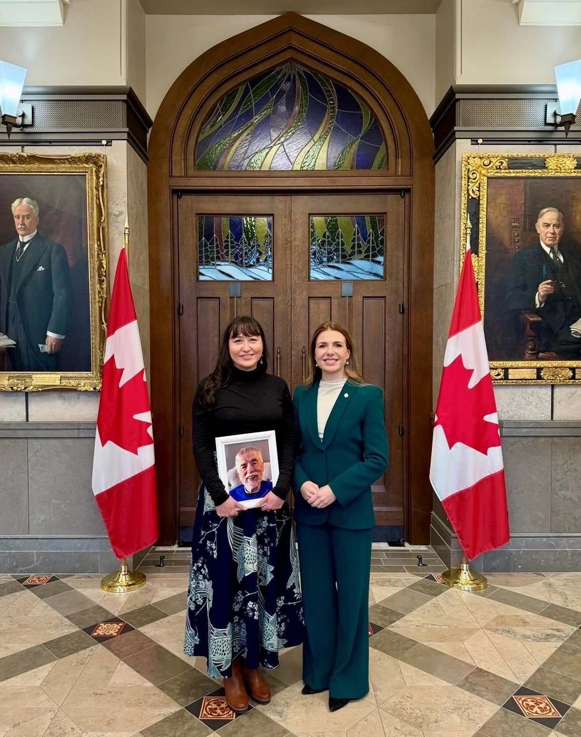 Britt Moberg, holding a picture of Earl Moberg, and MP Raquel Dancho, standing outside the House of Commons after presenting the Silver Alert petition.